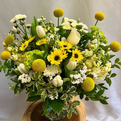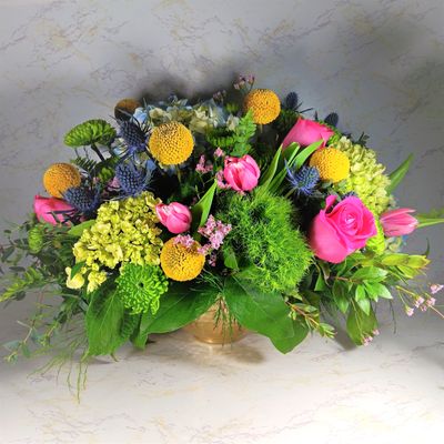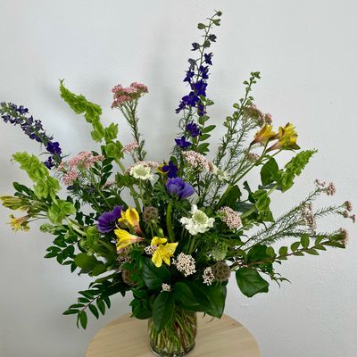"A delightfully unusual display of gorgeous spring-leaning blooms; a perfect way to brighten someone's day. Tall, airy, whimsical, and just a tad funky."